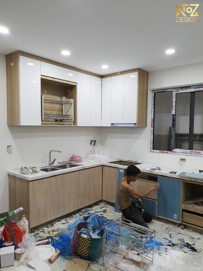 Đơn vị thi công đang tiến hành xử lý khu bếp của căn hộ